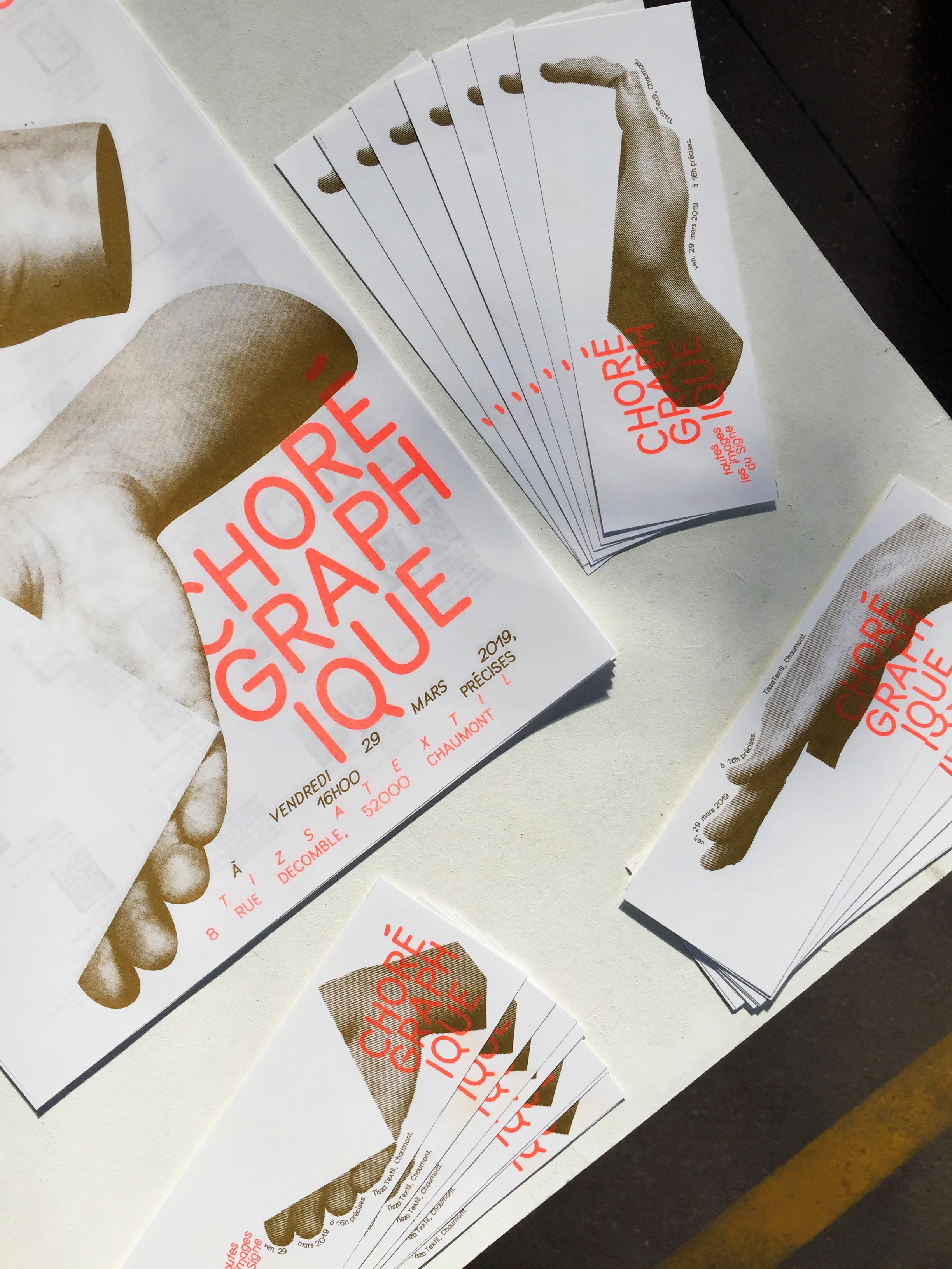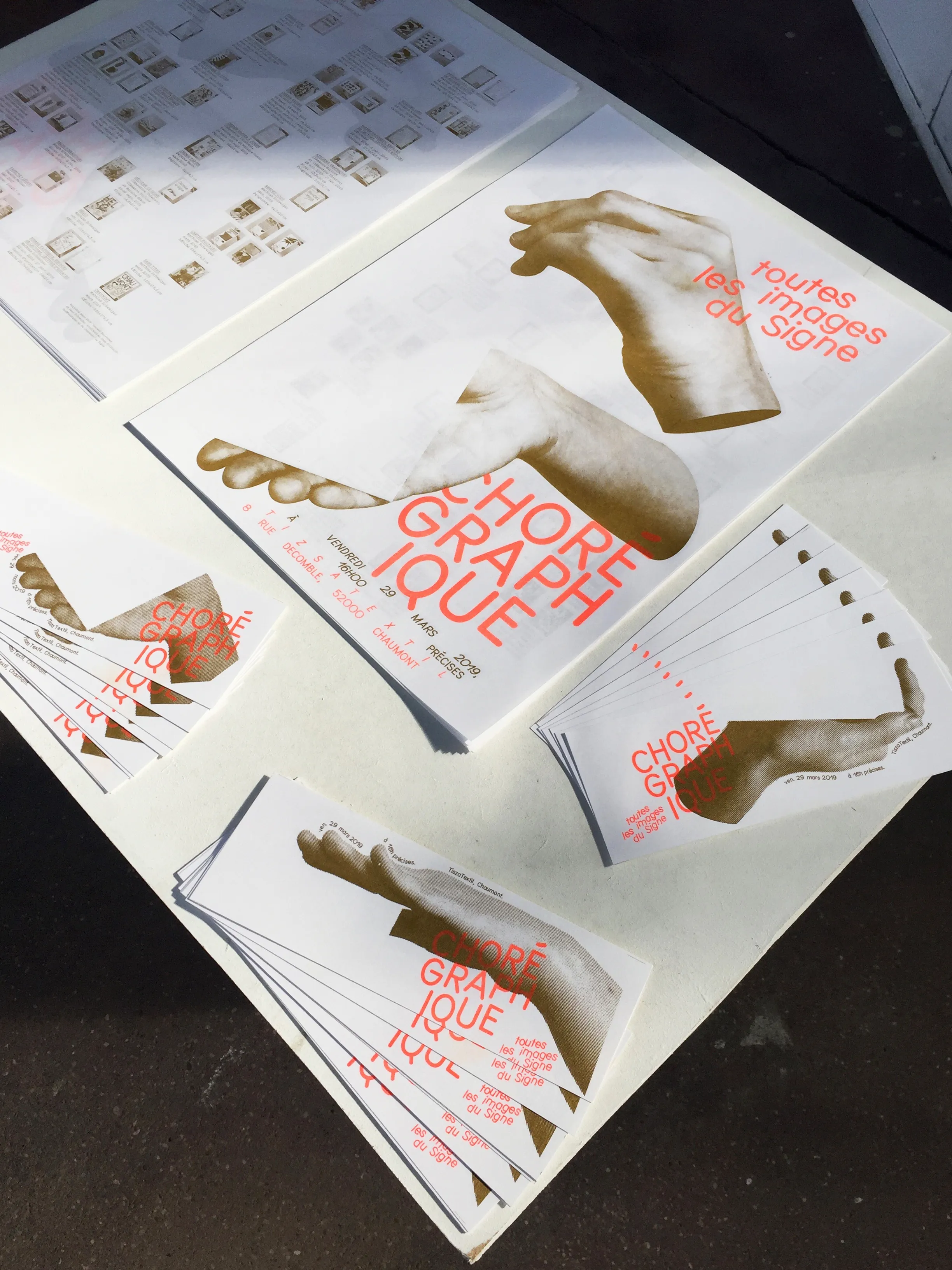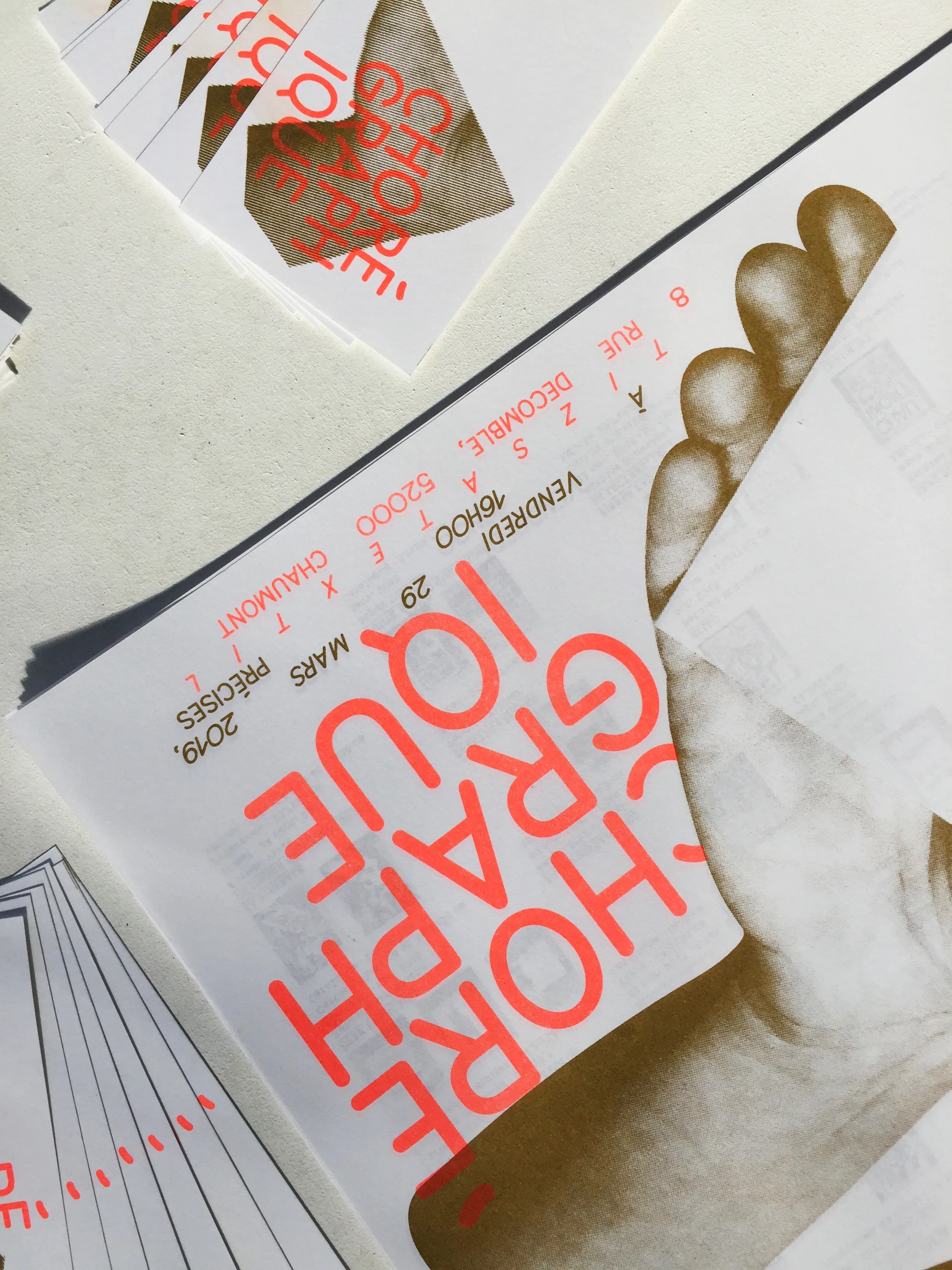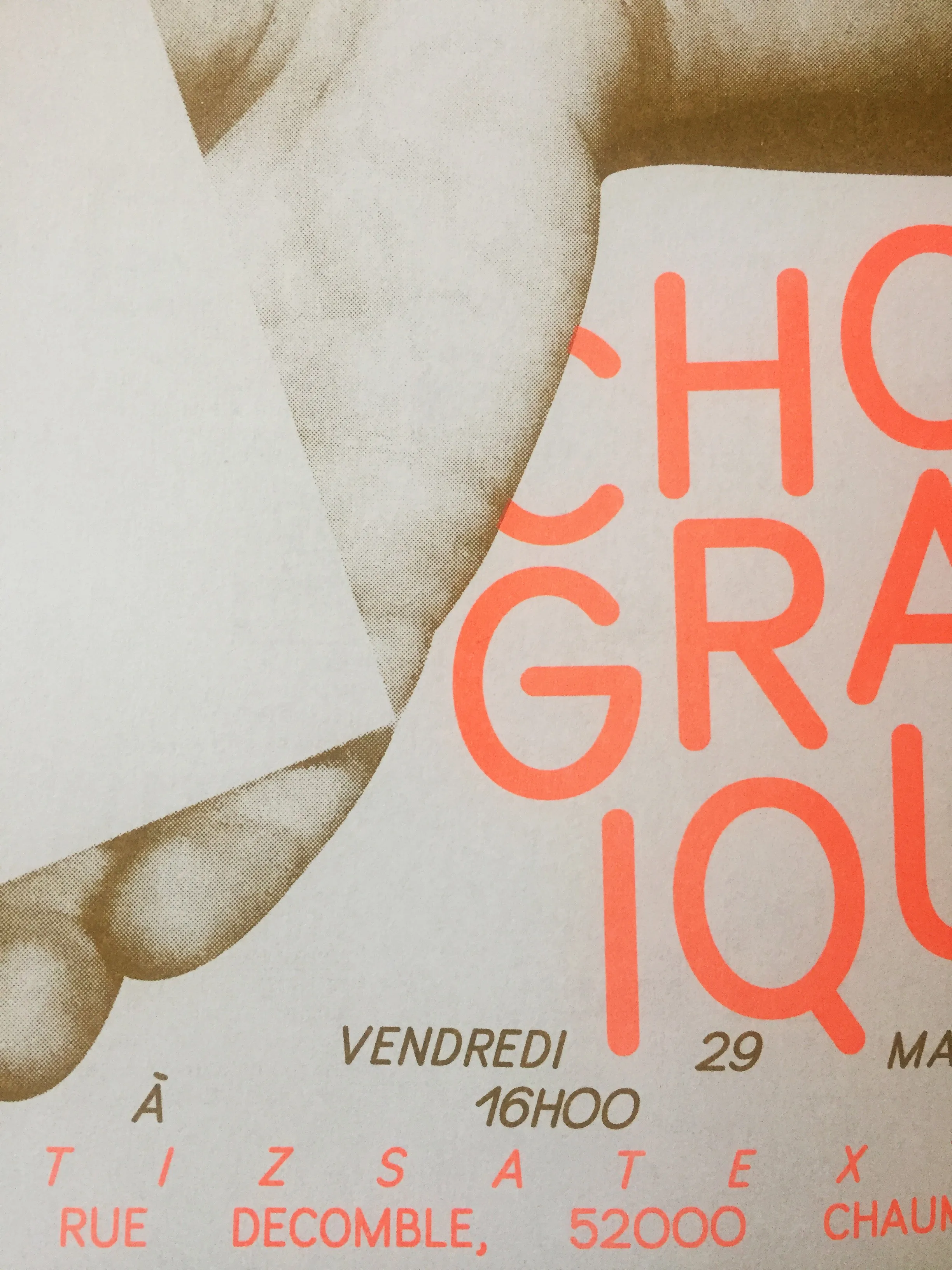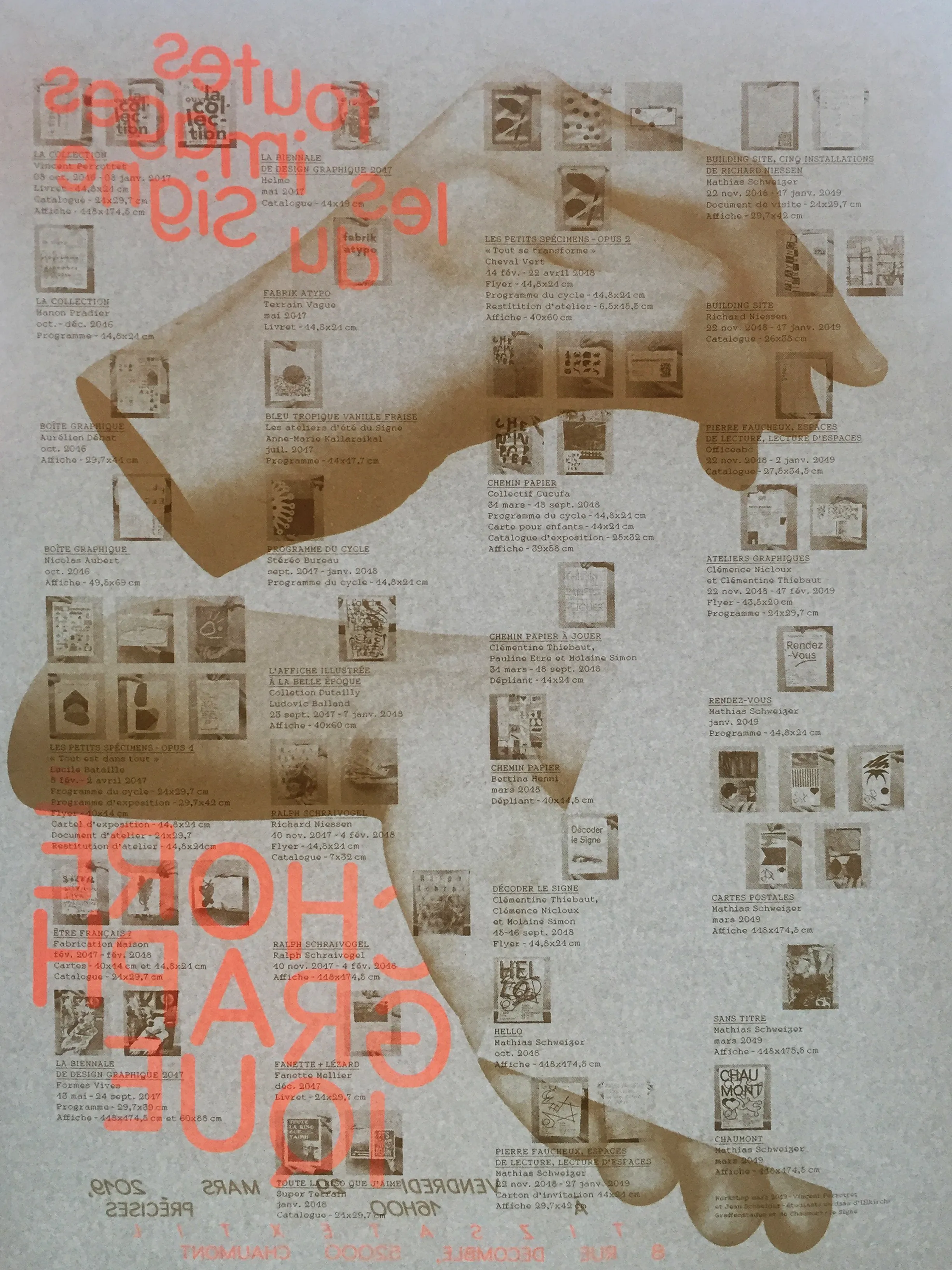 Poster and visual identity for the exhibition presenting the collection of the International Centre of Graphic Design in Chaumont. Supervised by Jean Schneider and Vincent Perrottet. Riso printed in gold and neon orange.