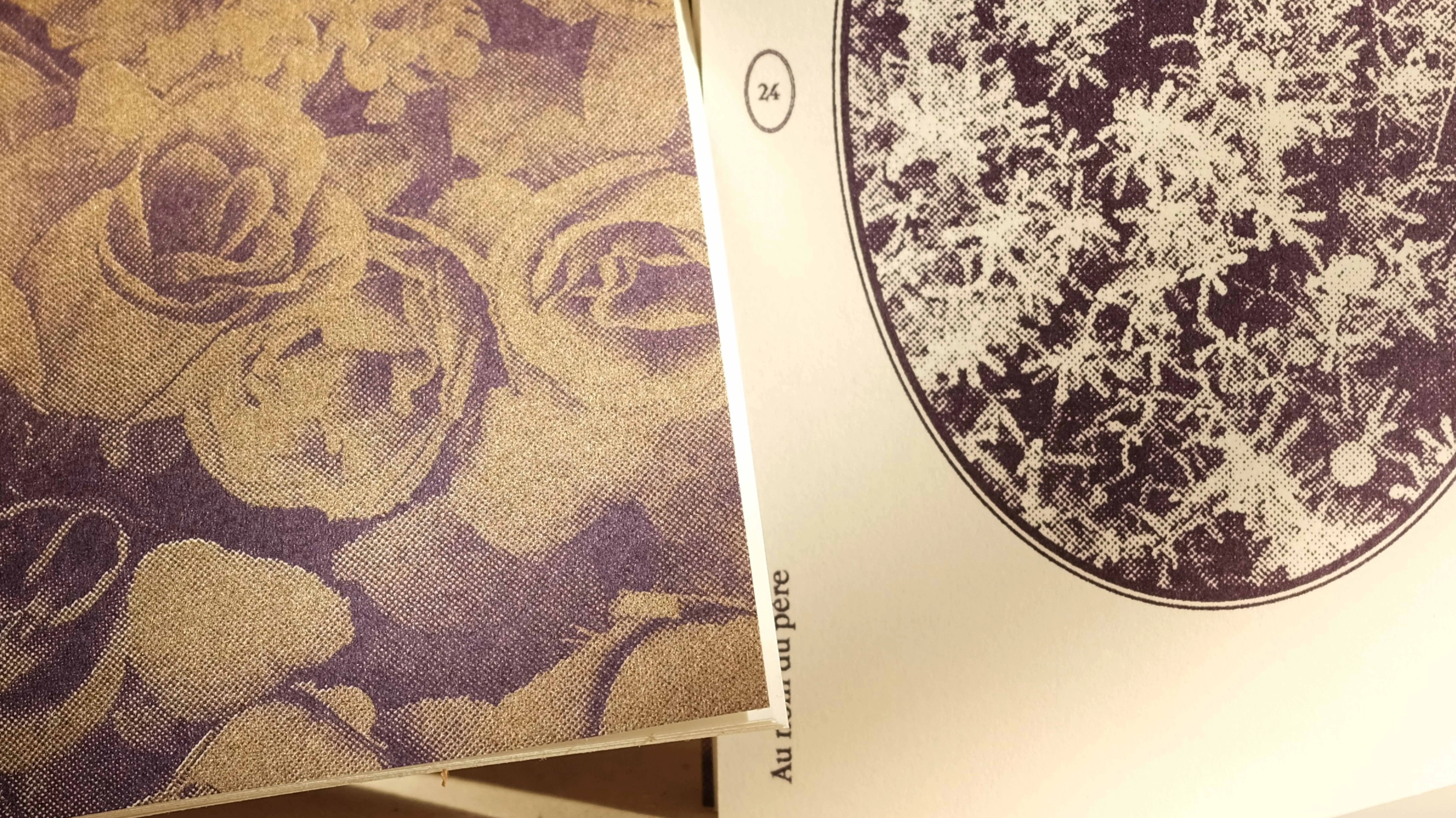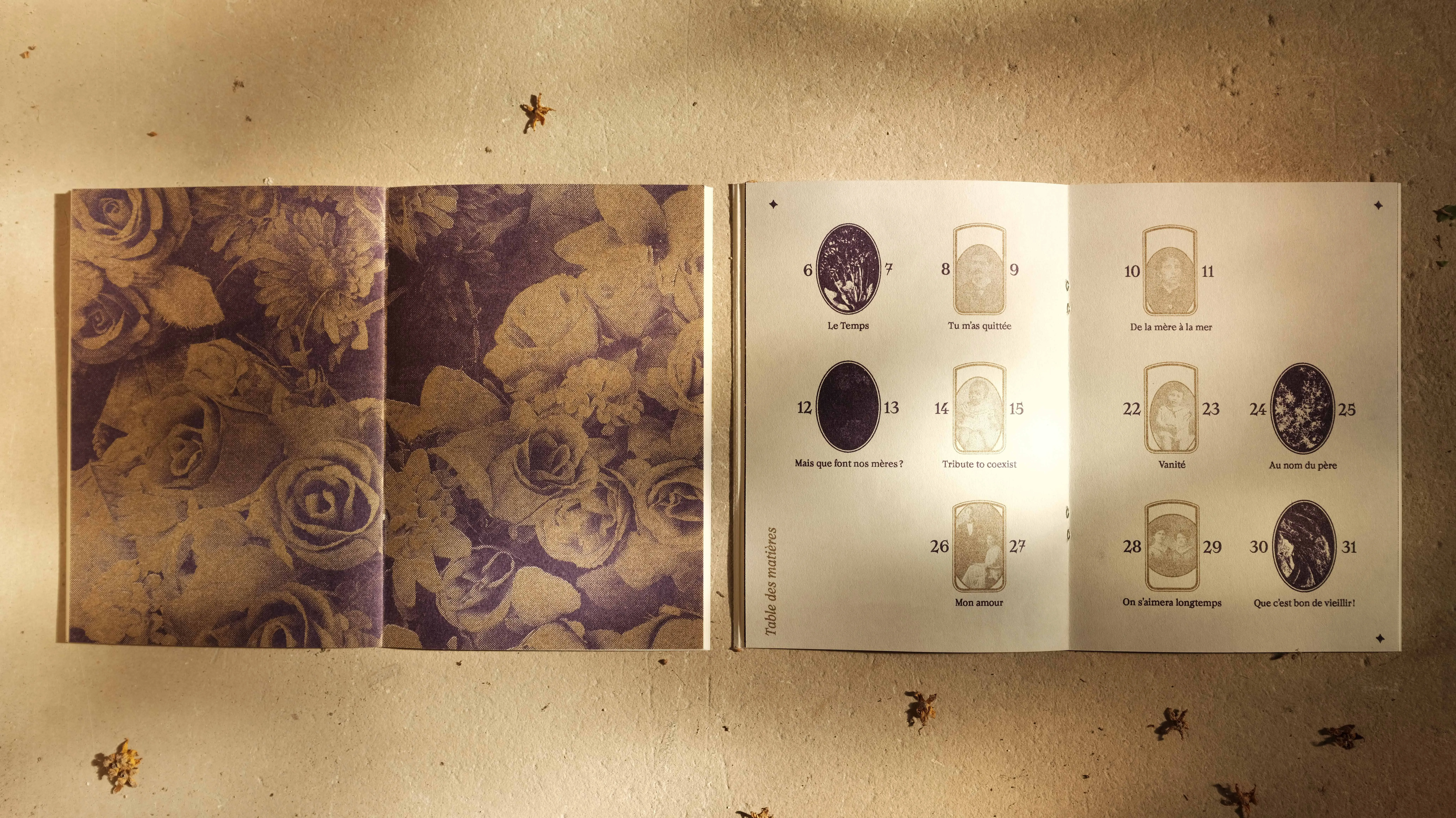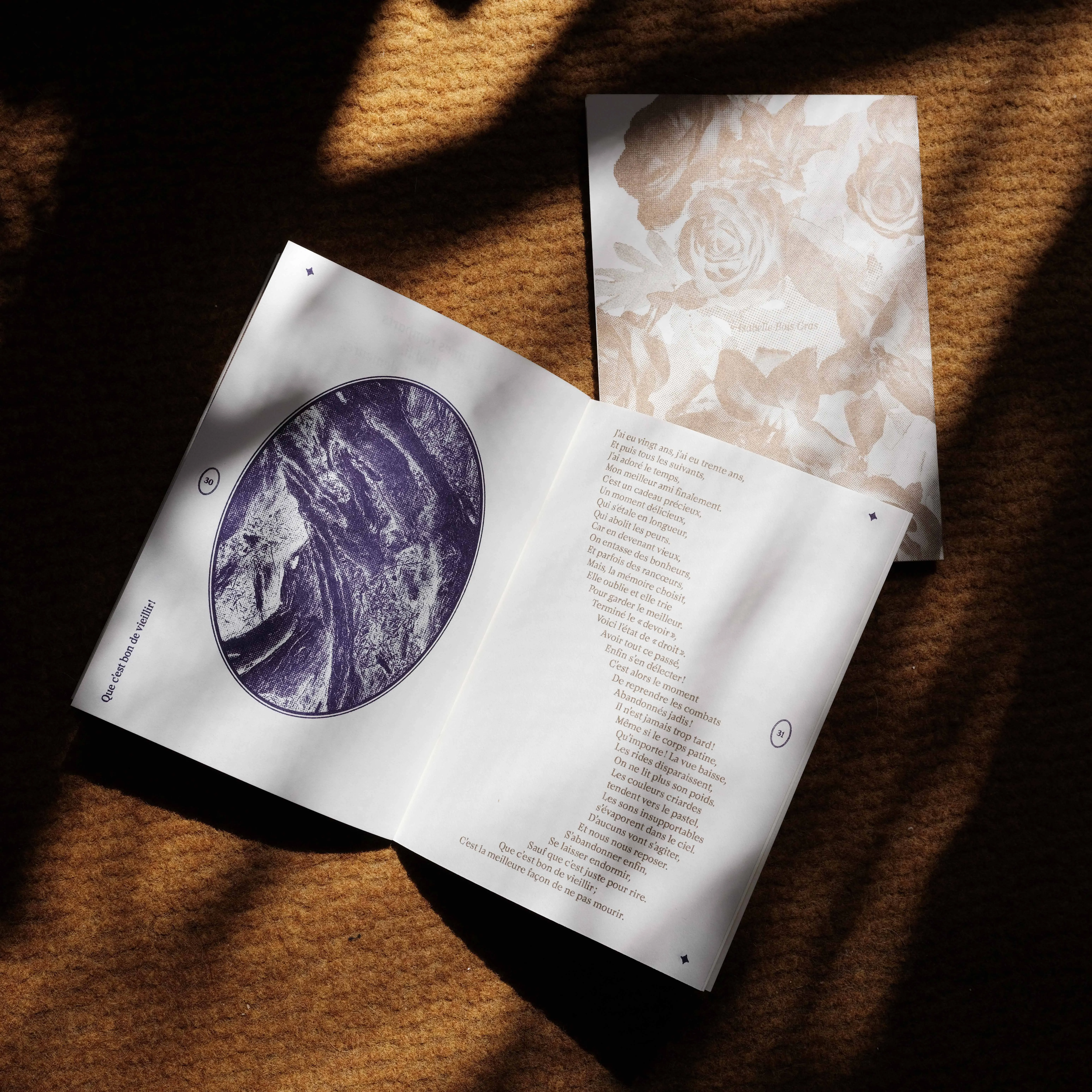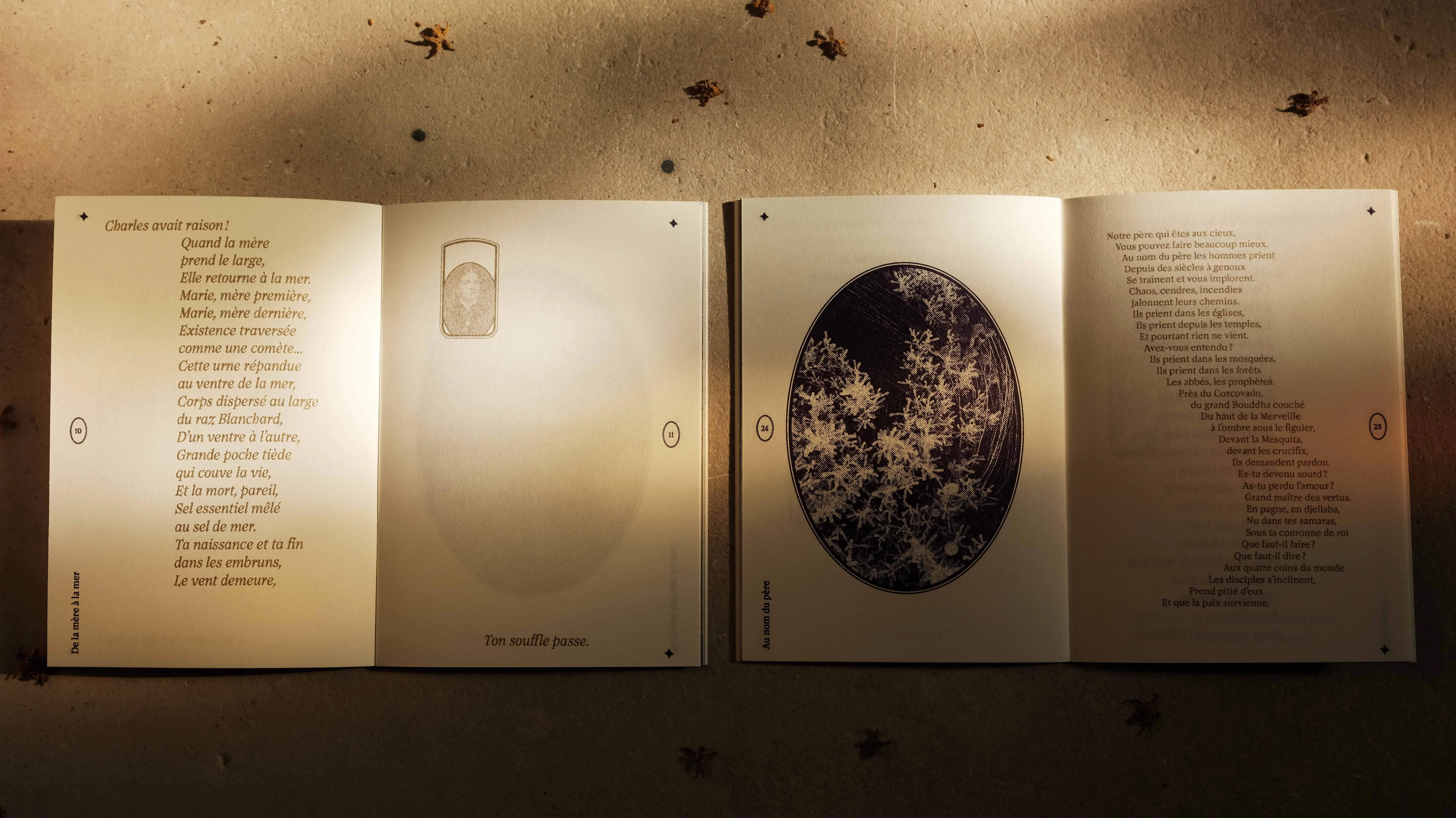 Layout of a collection of pagan poems written by Isabelle Bois Cras, supposed to be read at non religious ceremonies related to the loss of a loved one. Riso printed in Gold and dark purple.
