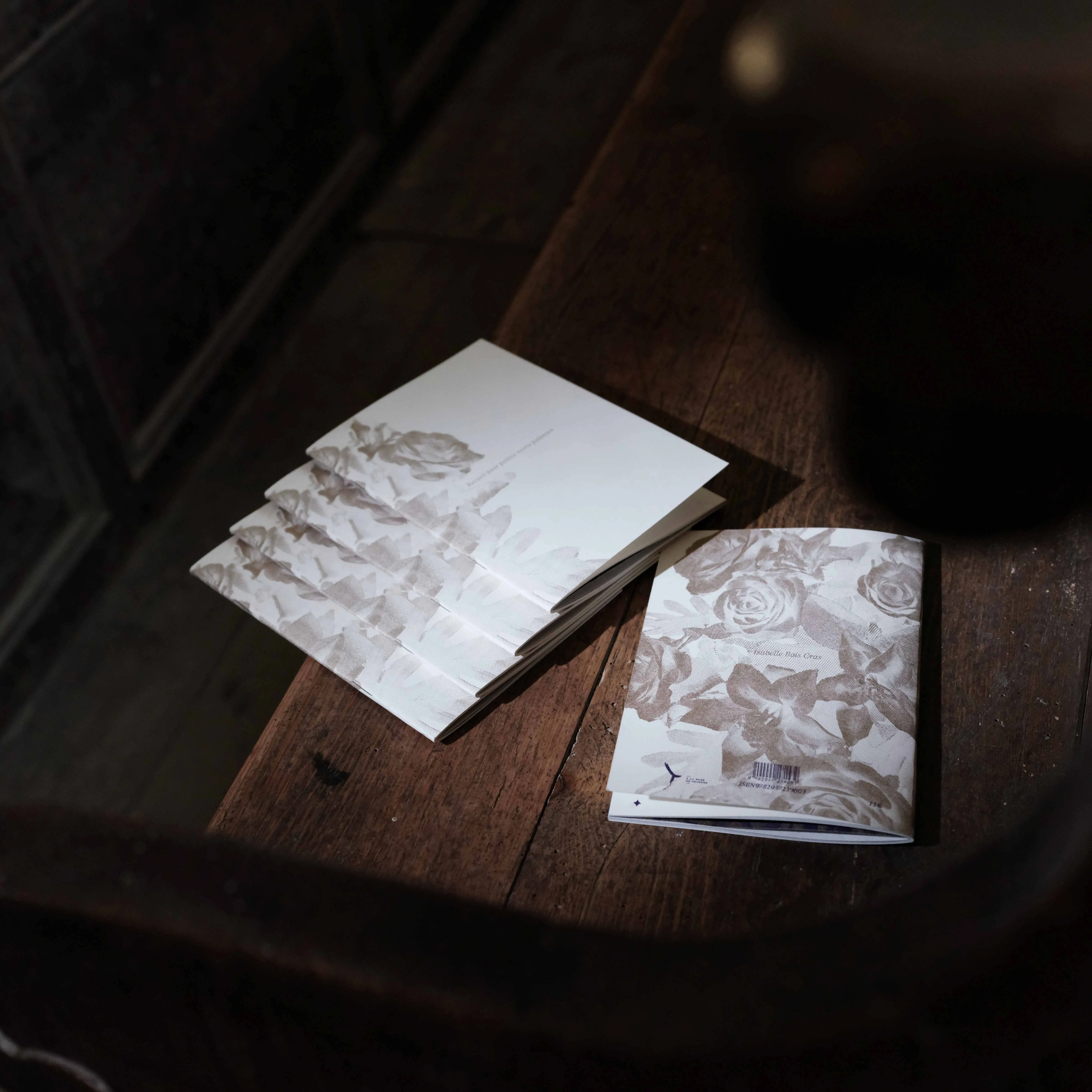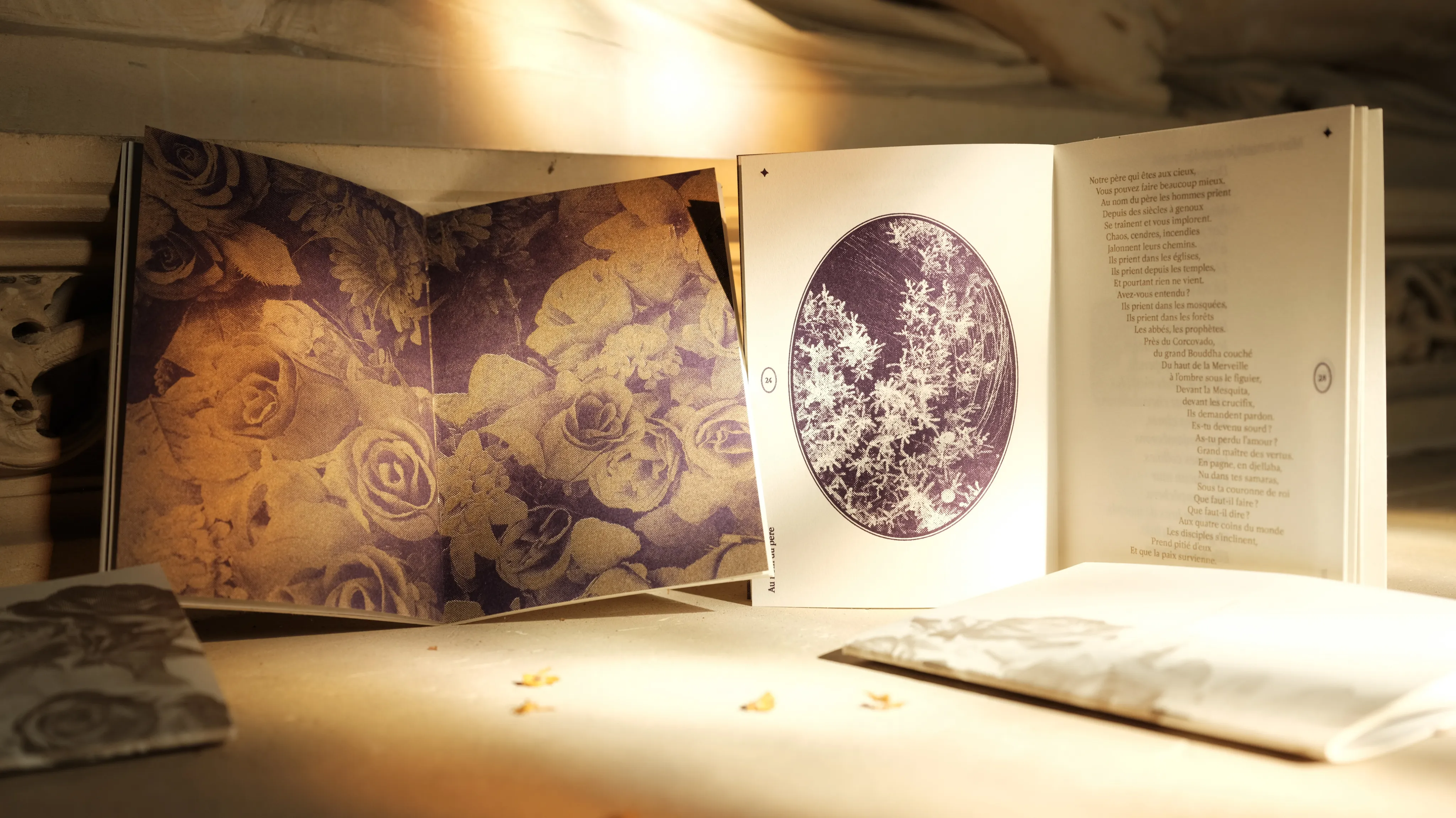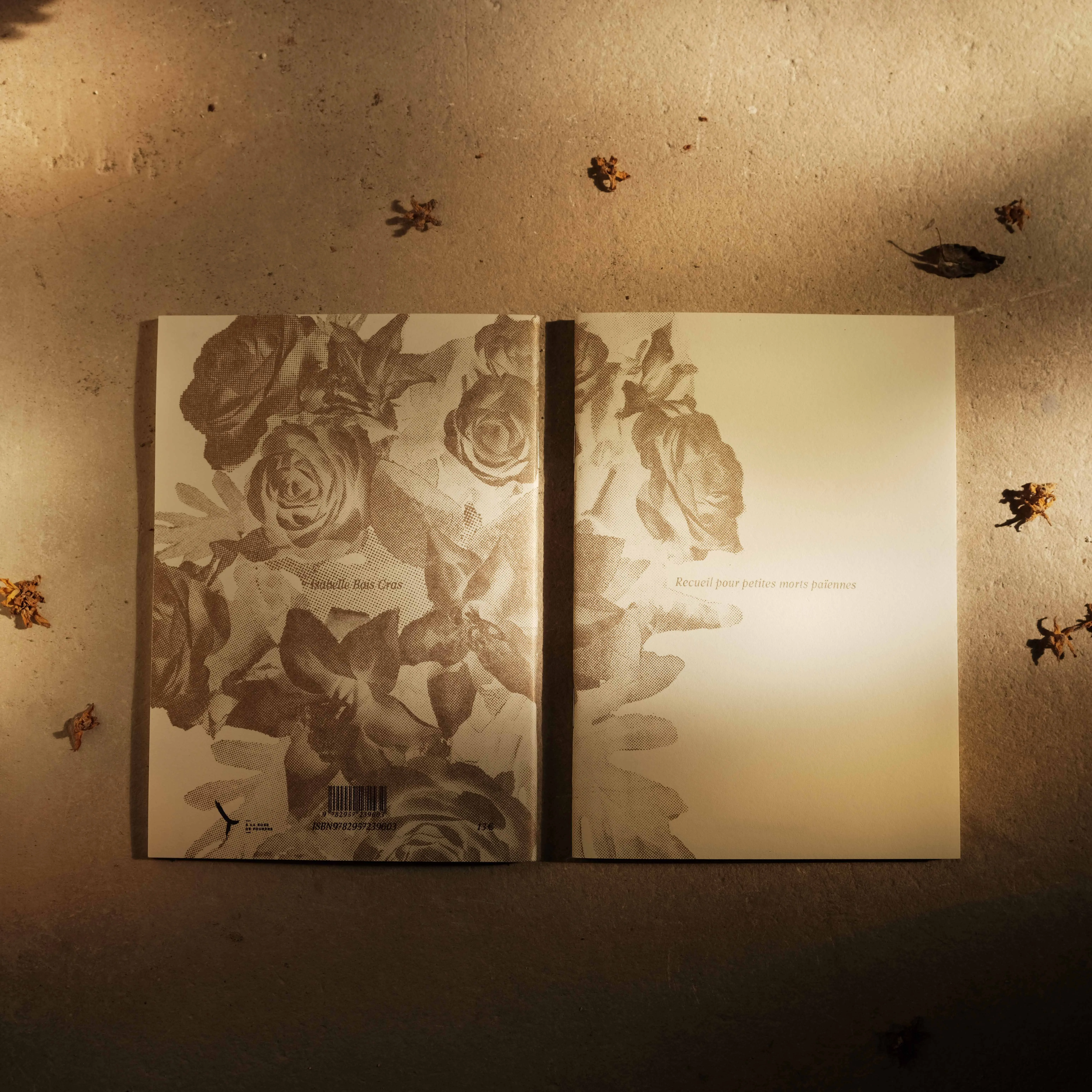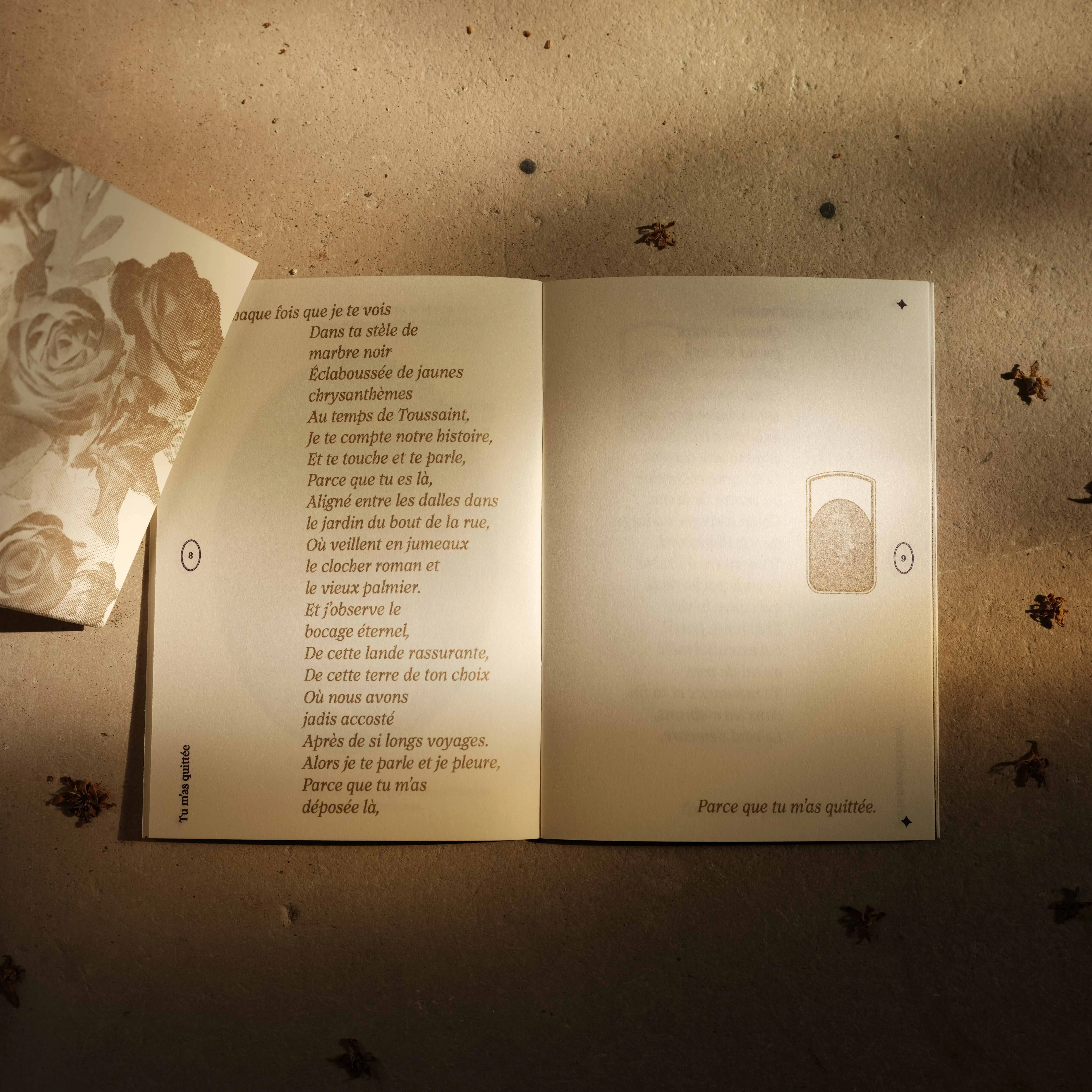 Layout of a collection of pagan poems written by Isabelle Bois Cras, supposed to be read at non religious ceremonies related to the loss of a loved one. Riso printed in Gold and dark purple.