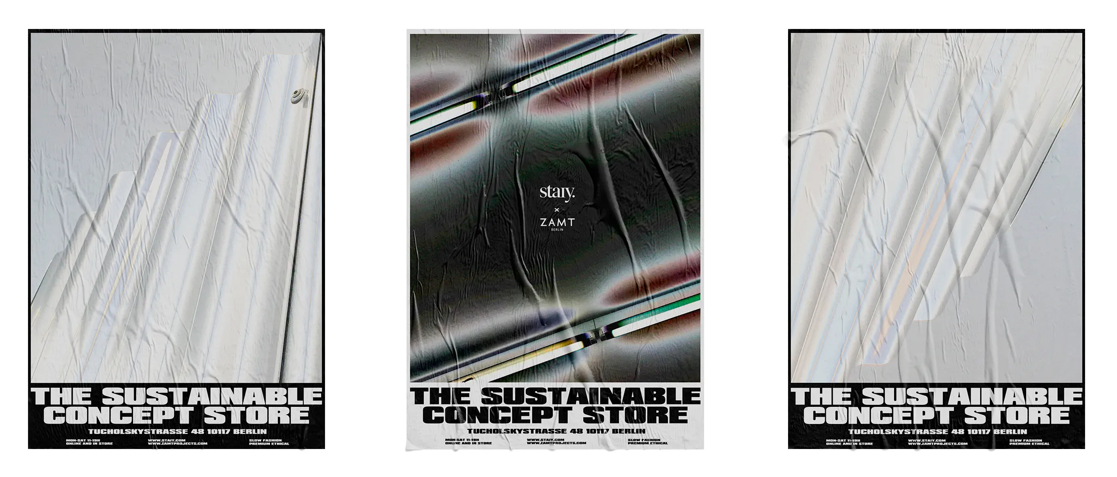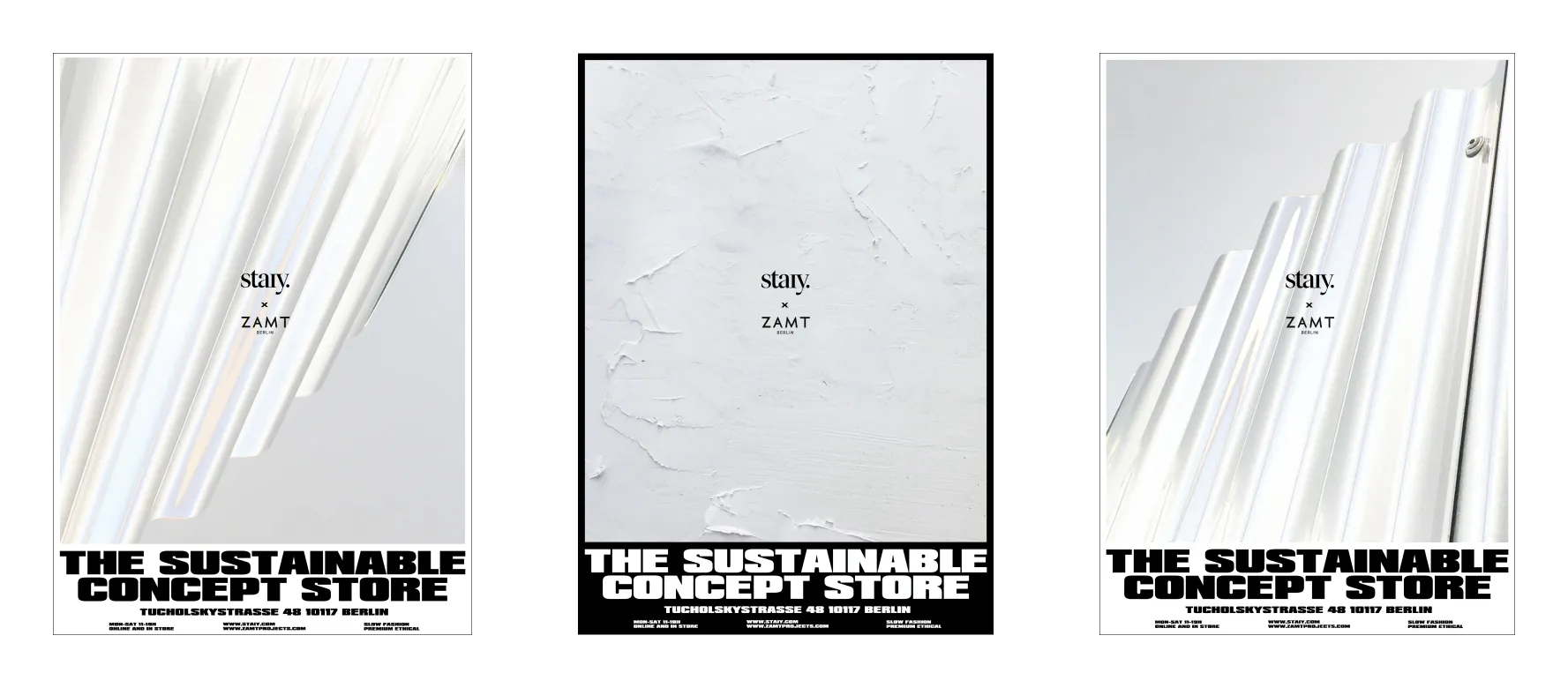 Series of posters created for the opening of the Staiy x Zamt concept store in Berlin. Created to be put together in pairs, threes or more, this system offers infinite possibilities for street wall compositions. Each poster shows a photo I took of textures observed in the concept store.